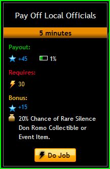 Earlier this evening, many players received a new collection to vault with no explanation associated with it (1). As predicted, it turns out to be another Featured Job Event. The name of this event is Silence Don Romo (just like the collection). It should come as no surprise that Silence Don Romo is identical to all the other featured job events that we have seen in the past (Whack Jimmy The Rat, Fix The Global Cup). We need to gain 100% job mastery and find all the collection items to get the "Boss of Bosses" Achievement.