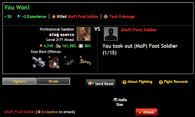 Take out 15 Foot Soldiers from another Family created by Zynga called (MoP). Each one costs 6 stamina to attack.