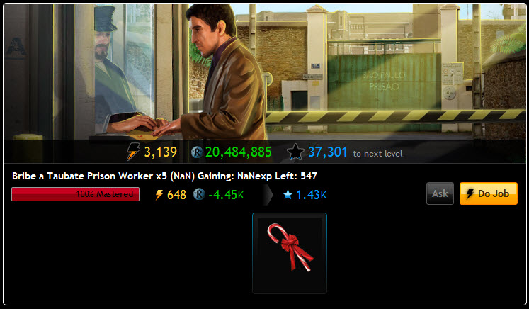 If you didn't get 150 Wreaths, they will still drop as well but at a much lower rate. I spent about 20K energy to get the one shown below. It seems that one Wreath will drop for about every 5 or 6 Candy Canes. There is very little consistency between accounts with this event. Some players are not getting very many to drop and have had to battle it out with Customer Support. I know for a fact there is a problem because I've spent over 400,000 energy on alternate account and haven't gotten any Wreaths or Candy Canes. It seems players who weren't getting items from fights and robs have noticed a fix.
