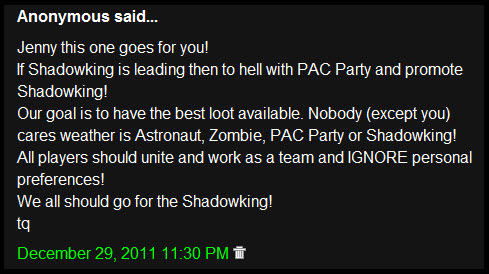 The New Year's Resolution Event has brought a lot of attention to the Ms. PAC Party loot item. Yesterday there was a spam battle on the Mafia Wars Loot Lady Fan Page and players were campaigning votes for both Ms. PAC and the Shadow King. Those who were in favor of the Shadow King were being strategic (or spiteful) and felt he was the best option because he had the early lead. Since Day 1, I told players the majority of my votes were going to Ms. PAC (1).
