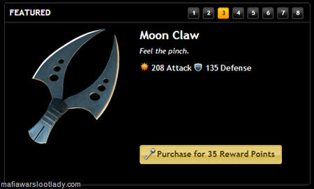 There is a new Limited Edition item available in the Marketplace. The Moon Claw has stats of 208/135 and costs 35 reward points