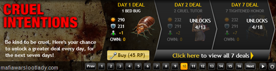 The 30th 7 Day Deal Promotion is called Cruel Intentions and is now available. Each ‘Deal’ costs 45 reward points and comes with 1-7 of each item(s) featured in the deal as well as skill points. If you purchase all 7 deals, you will end up with 28 loot items and +28 skill points for a total of 315 reward points. If you don’t plan on purchasing all 7 deals then the cost per item increases and you are getting an even worse deal. The promotion will last through April 22nd.