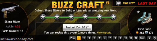 Not that anyone cares but this is the last day to be frustrated by the 3rd installment of the Buzz Craft . This was doomed from the beginning when the task at hand wasn’t even possible because there wasn’t enough time to get all the parts required [1]. That on top of the request issues really made this one a Buzz Kill [1]. I managed to get 6 gold items and 6 silver and today I may get some bronze but the efforts are not worth the rewards. I will be very happy to see this off the home page and we can only hope Zynga won’t release the 4th one [1] .