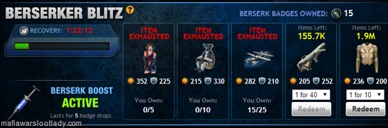 Even though the top 3 items of the Berserker Blitz event have been exhausted, Zynga is hoping that the fighters will take advantage of the Berserk Boost which costs 2 reward points and lasts until 5 Berserk Badges drop. Below is an outline of how this boost works.