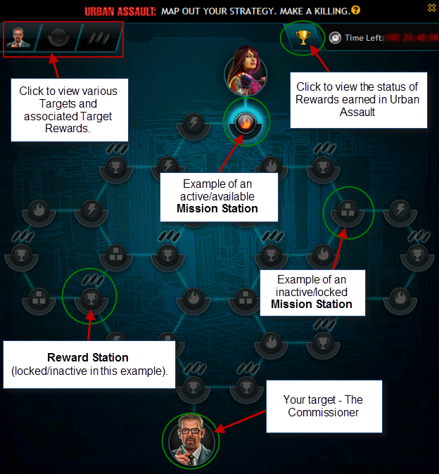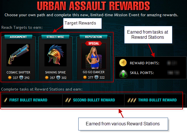 Urban Assault game board will display all the Mission and Reward Stations and will guide you through your progress in the event.